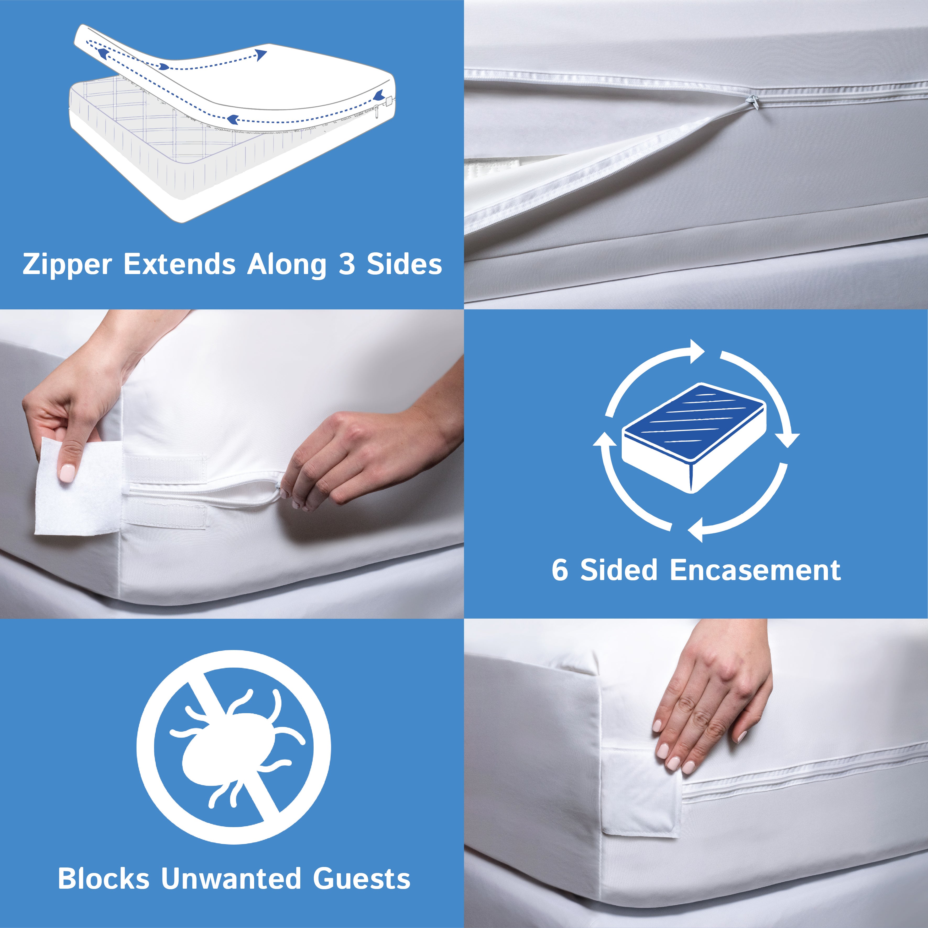 • SIX SIDED ZIPPERED ENCASEMENT - Completely encases your mattress on all sides. Our premium zippered encasements are equipped with a Velcro zipper seal to ensure that nothing gets in! Say good-bye to troublesome pets that can ruin your mattress and bring discomfort to your life. Take precaution and sleep worry-free knowing that your mattress is shielded and protected. Be smart and protect your investment with a quality mattress encasement!